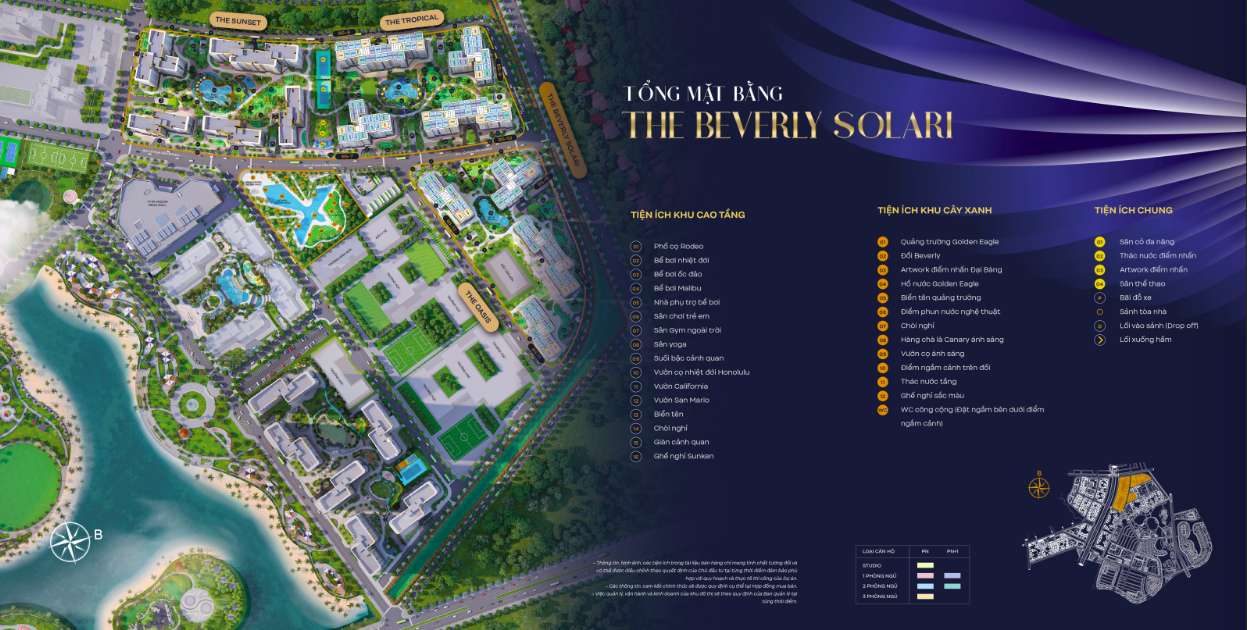 Dự án được chia thành ba phân khu độc đáo là The Oasis, The Tropical và The Sunset, mỗi phân khu mang một phong cách riêng biệt, đáp ứng đa dạng nhu cầu của cư dân. The Beverly Solari không chỉ cung cấp không gian sống lý tưởng mà còn tích hợp hệ thống tiện ích đỉnh cao, từ trung tâm thương mại Vincom Mega Mall, hệ thống trường học Vinschool, bệnh viện Vinmec, đến công viên trung tâm rộng 36ha.
